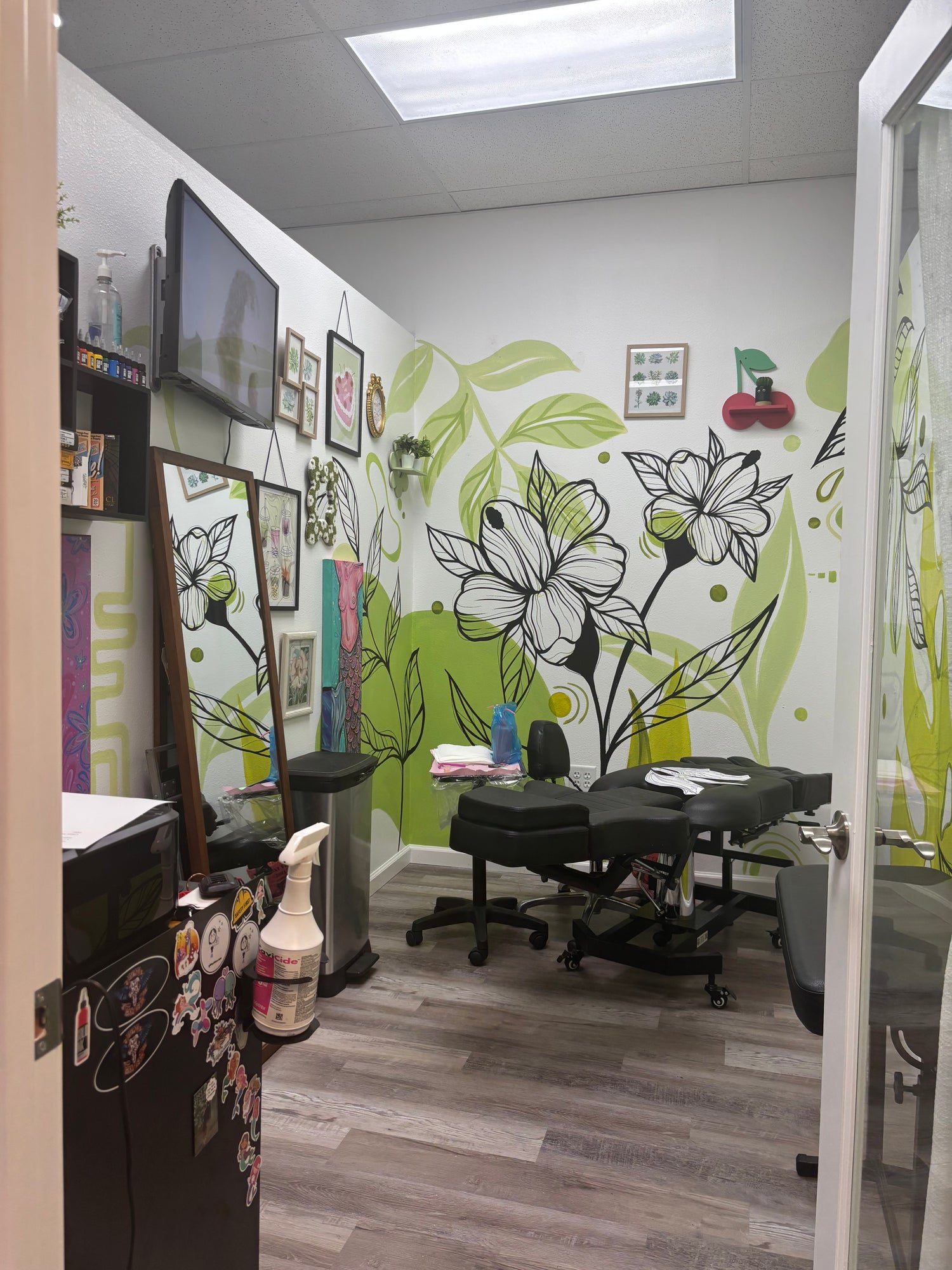 A four wall mural in a private tattoo suite in Remedy Salon Suites