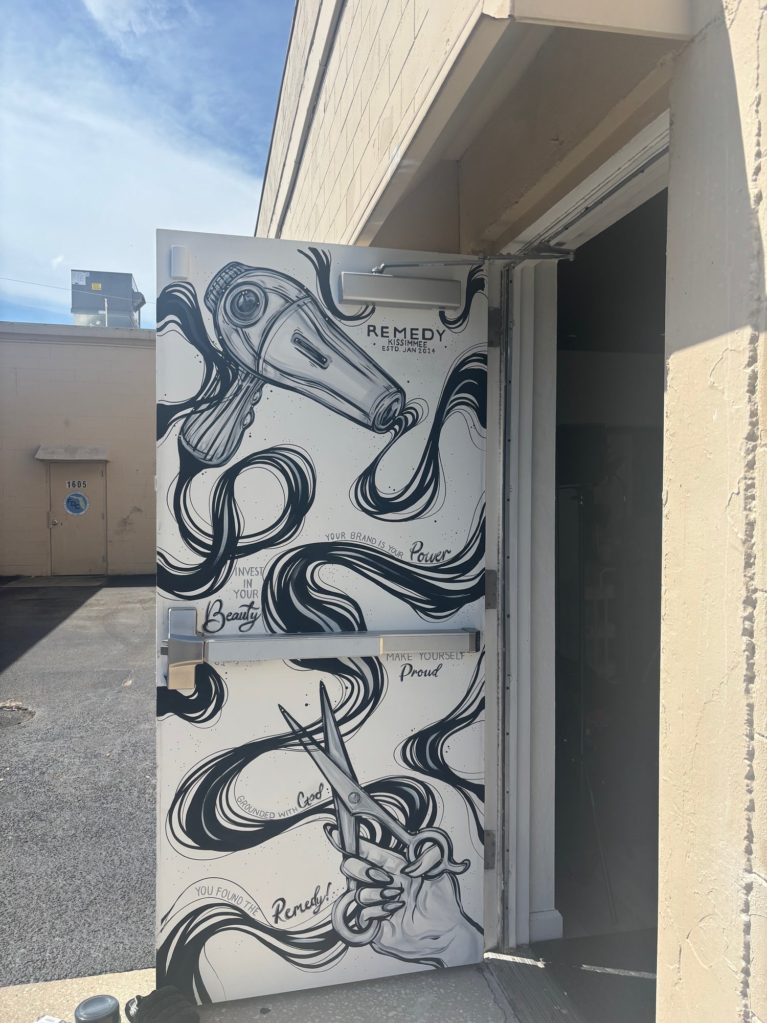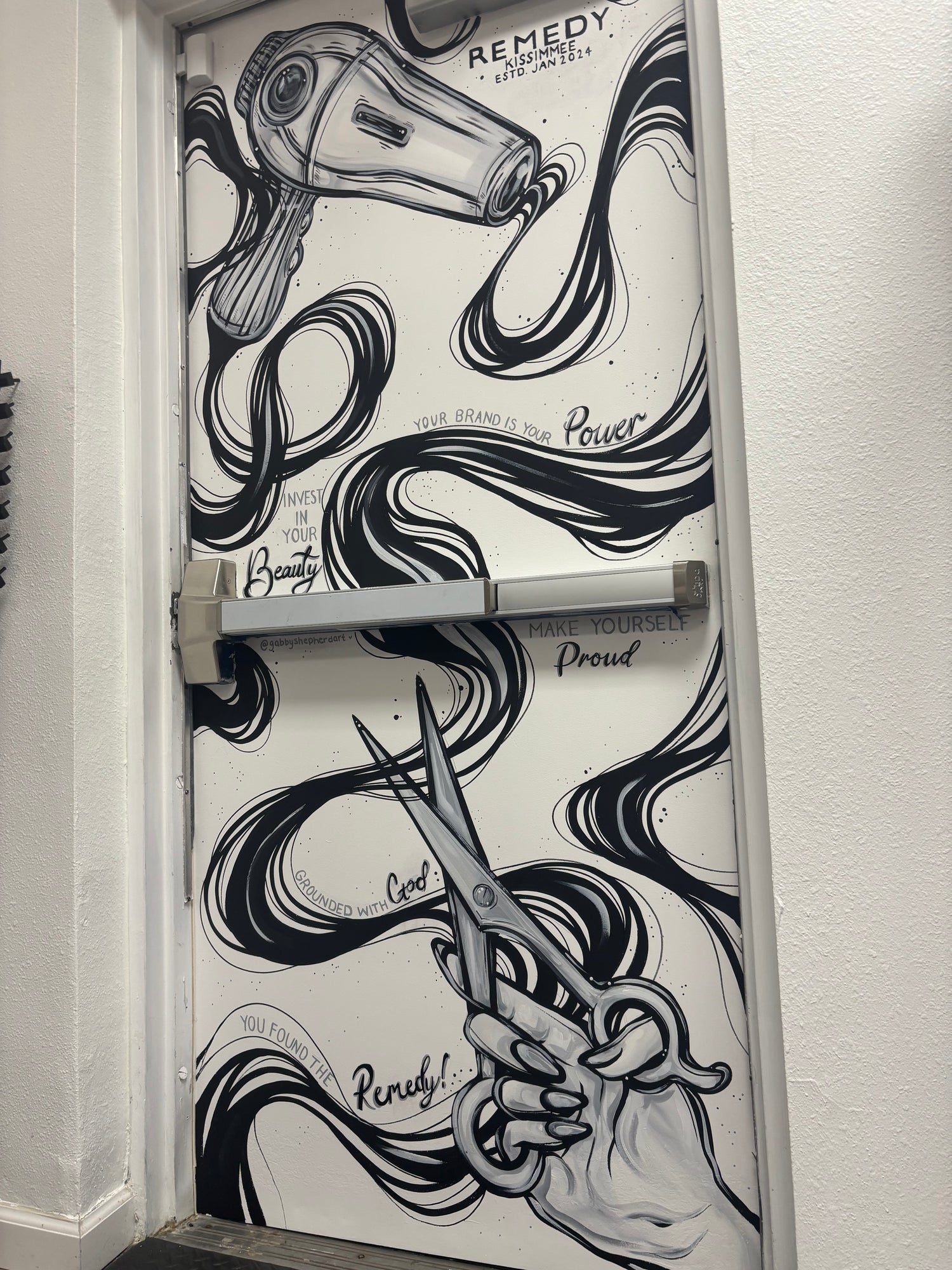 A custom mural done on the exit door of Remedy Salon Suites in Kissimmee, FL