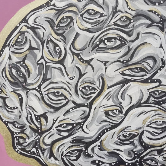 acrylic, gouache, metallics, and glitter on canvas